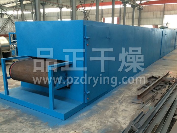 物料由加料器均勻地鋪在網(wǎng)帶上,網(wǎng)帶一般采用12-60目不銹鋼絲網(wǎng),由傳動(dòng)裝置拖動(dòng)在干燥機(jī)內(nèi)移動(dòng)。干燥機(jī)由若干單元組成,每一單元熱風(fēng)獨(dú)立循環(huán),部分尾氣由專門排濕風(fēng)機(jī)排出,廢氣由調(diào)節(jié)閥控制,熱氣由下往上或由上往下穿過(guò)鋪滿物料的網(wǎng)帶完成熱量與質(zhì)量傳遞的進(jìn)程,帶走物料水份。網(wǎng)帶緩慢移動(dòng),運(yùn)行速度可根據(jù)物料溫度自由調(diào)節(jié),干燥后的成品連續(xù)落入收料器中。上下循環(huán)單元根據(jù)用戶需要可靈活配備,單元數(shù)量亦可根據(jù)需要選取。